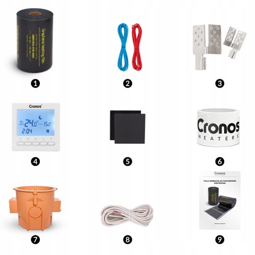 Zestaw z folią grzewczą na podczerwień marki Cronos zawiera: