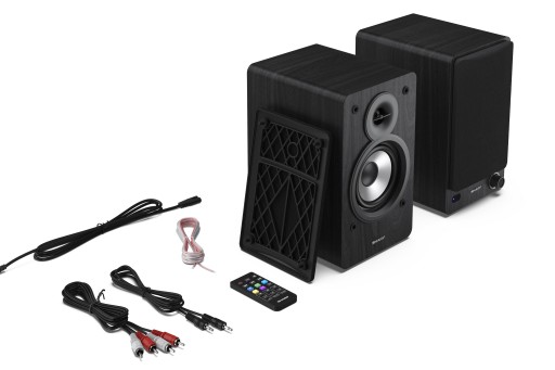 - Zawartość opakowania: Głośniki Regałowe x2, pilot zdalnego sterowania (z bateriami), przewód głośnikowy (3 m), przewód RCA (1,2 m), przewód audio AUX (1,2 m), przewód zasilający, dokumentacja dla użytkownika