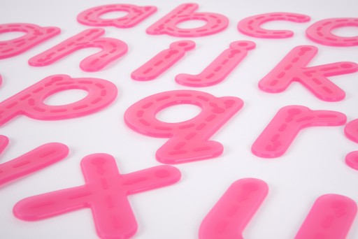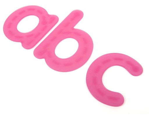 - 26 transparentnych, silikonowych liter alfabetu w kolorze różowym, o wymiarach 120 mm