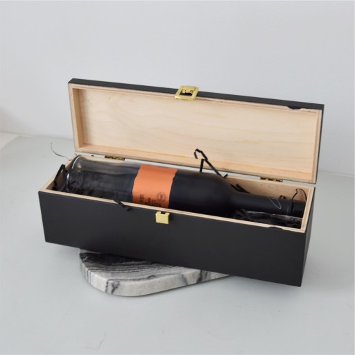 - 1 x czarny drewniany kuferek na 1 butelkę wymiar: 34,5 cm x 11 cm x 9 cm