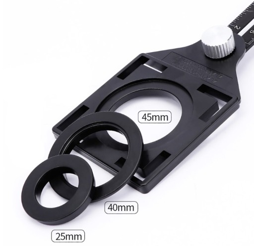 Mocno skręcane ramiona gwarantują zachowanie wyznaczonego przymiaru, a co za tym idzie możliwość przeniesienia kilku takich samych otworów w różne miejsca bez potrzeby ponownego ustawiania narzędzia.