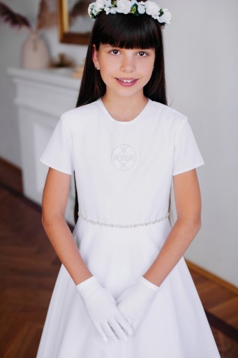 Białe rękawiczki komunijne dla dziewczynki pełne, krótkie. Wykonane z elastycznego rozciągliwego materiału. Wzór klasyczny bez zdobienia idealnie pasuje do alby lub bogatej sukni.