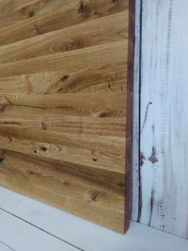 Blat z drewna litego jest to mebel wieczny. Wystarczy odnowić powłokę zabezpieczającą (olej lub lakier) , a będzie wygladał jak nowy. Elementy kleimy wzdłużnie w taki sposób aby rysunek tworzył spójną całość.