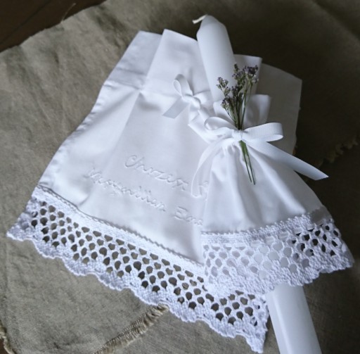 - szatka do chrztu (krzyżmo, chrzczonka) - wykonana ze śnieżnobiałej bawełny z szeroką, białą bawełnianą koronką i delikatną wstążeczką z tasiemki rypsowej. Szatka ozdobiona personalizacją wykonaną haftem ręcznym Wymiary szatki ok. 24 x 24 cm
