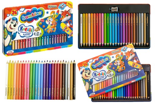 Kredki BAMBINO w oprawie drewnianej 26 kolorów + temperówka, pudełko metalowe