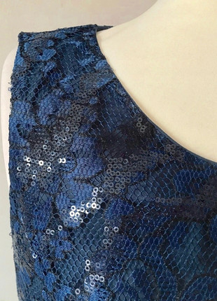 Zapraszam do zakupu sukienki granatowo czarnej koronki ozdobionej cekinami, z podszewką i zamkiem z boku.