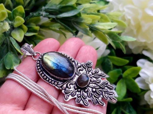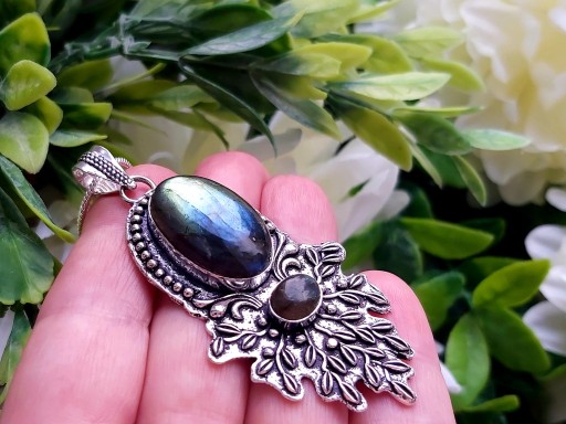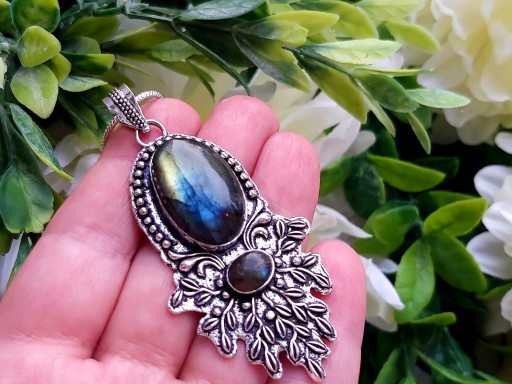 Zrobiono z indyjskiego srebra(ze stopu srebra i miedzi).Centrum wisiorka zdobi oprawiony naturalny Labradoryt Ognisty. Ręczne wykonanie indyjskiego jubilera. Nowy bez metki.