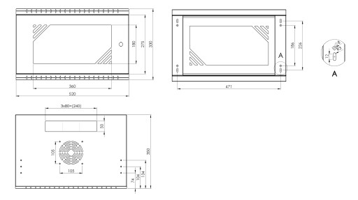 W dolnej i górnej części szafy RACK 19" znajduje się miejsce na montaż wentylatora (brak w zestawie) o wymiarach 120 x 120 mm (rozstaw śrub: 105 x 105 mm). Zapewnia to odpowiednie odprowadzenie ciepła z wnętrza szafy.