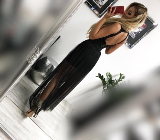 Ołówkowa, mini sukienka uszyta z eleganckiego materiału (nie naciąga się), z nakładaną spódnicą. Pod szyją pół okrągły dekolt. Na plecach sukienka zapinana jest na złoty zamek, raz guziczki na szyi. Spódnica zawiązywana jest w talii. Produkcja polska.