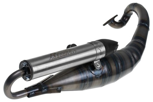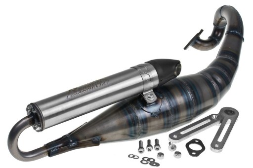 Wydech włoskiego producenta Giannelli - model Rekord. Poprawa osiągów i charakterystyki. Giannelli Rekord jest zdecydowanie najatrakcyjniejszym wizualnie sportowym wydechem dedykowanym do cylindrów zarówno oryginalnych 50cc jak i poziomu Sport / Midrace 50-70cc. Do osiągów włoski producent dokłada precyzyjne wykonanie oraz atrakcyjną aluminiową końcówkę. Dobry wydech w bardzo atrakcyjnej cenie. W zestawie znajdują się: kompletne mocowanie, śrubki, uszczelki.