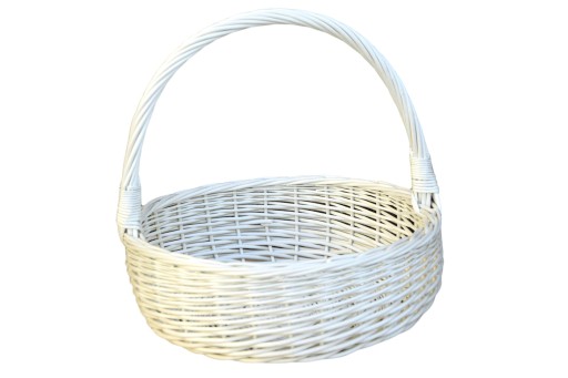 Biały okrągły koszyk na kwiaty, prezent (NIE MALOWANY FARBĄ – biel wpadająca w delikatny kremowy) – kosz wykonany jest z naturalnej polskiej wikliny. Staranne wykonanie kosza gwarantuje eksponowanie jego zawartości – powszechnie wykorzystywany w kwiaciarniach do eksponowania kwiatów, jako kosz na prezenty.