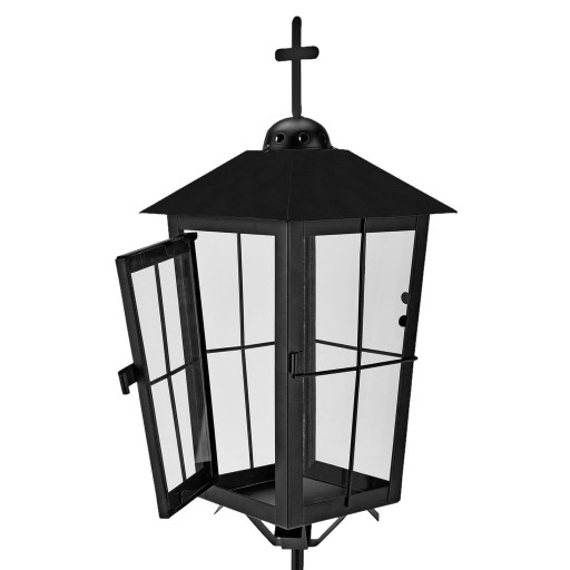 Lampion marki Menuett jest wykonany z czarnej blachy stalowej. Ma otwierane okienka umożliwiające łatwy dostęp do środka. Strona wewnętrzna ma ok. 20 cm wysokości i 8 cm szerokości w każdym miejscu, dlatego do lampionu pasują mniejsze wkłady. W zestawie grot o długości 40 cm ułatwiający montaż.
