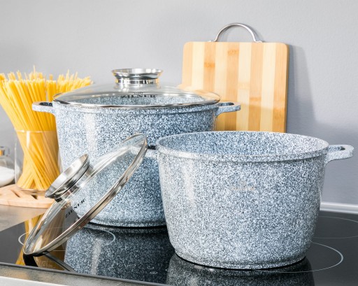 Wykonane z odlewu aluminiowego pokrytego marmurową powłoką nieprzywierającą.