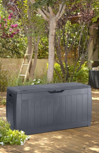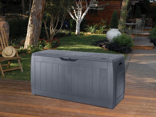 Plastikowa skrzynia do przechowywania najróżniejszych przedmiotów (poduszki, sprzęt ogrodowy) firmy KETER. Zaletą skrzyni jest łatwy montaż bez konieczności użycia narzędzi (wszystko można słożyć jak klocki), wysoka jakość skrzyni oraz nowoczesny design. Struktura imitująca drewno świetnie wpasuje się do każdego ogrodu lub na taras.