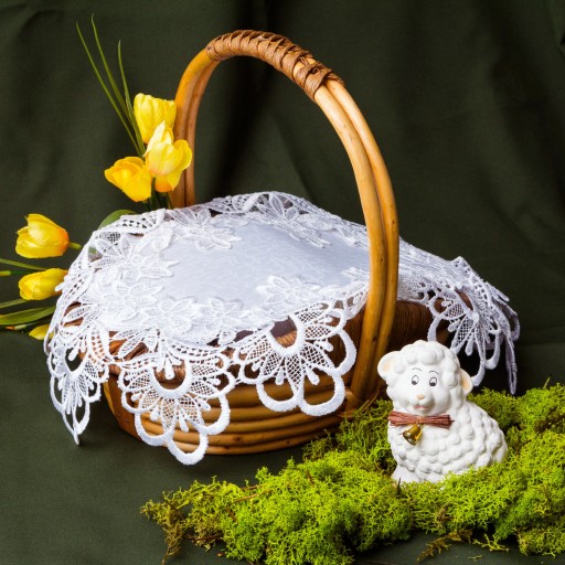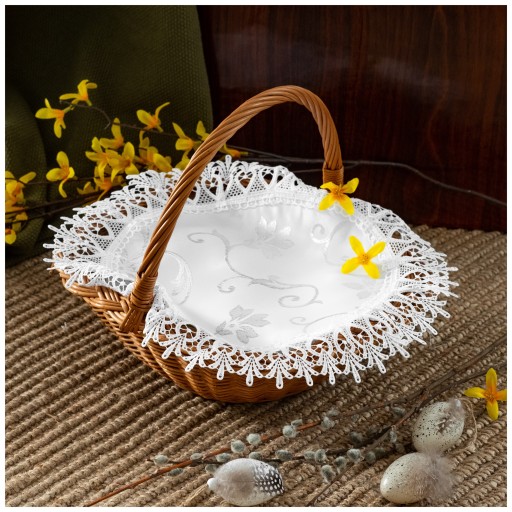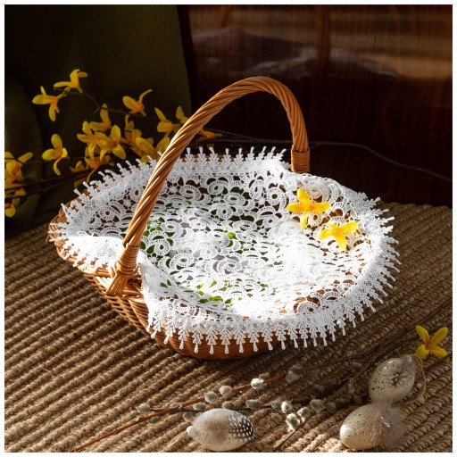 ✅Biała serwetka do koszyczka wielkanocnego / święconki 40 cm, wykonana z delikatnego poliestru koloru śnieżnej bieli wykończona koronką gipiurową.