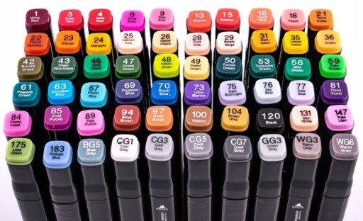 Zestaw dwustronnych markerów w 60 transparentnych barwach.