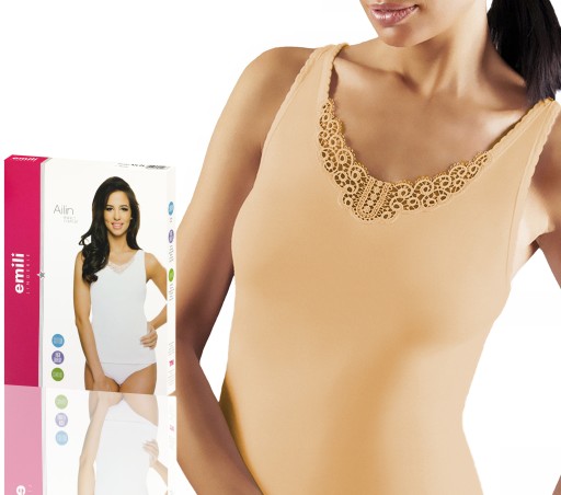 To propozycja dla pań łączących wygodę z elegancją i stylem każdego dnia. Jednolita koszulka występująca w bazowej kolorystyce będzie idealnym uzupełnieniem każdej stylizacji! Została wykonana z najwyższej jakości materiału, zapewniającej dużą wytrzymalość, przewiewność i wysoki komfort noszenia, jest przy tym mięciutka i miła w dotyku niczym puch. Podkreśla figurę, idealnie dopasowuje się do kształtów ciała, nie marszczy się. Ładny krój (dekolt lekko spiczasty wykonczony kwiatowym wzorem) świetnie nadaje się zarówno pod obcisłą bluzkę, jak i do samodzielnego noszenia. Słowem: luksus wygody - przy perfekcyjnej prezentacji.