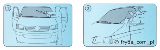 - Osłonę układamy symetrycznie na przedniej szybie, tak aby dolna część wsunięta była pod pióra wycieraczek