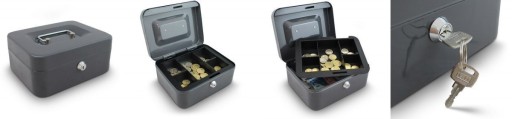 Fabrycznie nowa, wysokiej jakości metalowa kasetka do przechowywania lub transportu monet, banknotów lub innych wartościowych przedmiotów.Solidna i poręczna walizka z metalu wyposażona w sortownik do monet jest idealnym miejscem do przechowywania banknotów oraz monet. Na dole jest sporo miejsca na przykład na rachunki, paragony, monety, banknoty i inne przydatne przedmioty. Dla bezpieczeństwa kasetka jest zamykana na klucz. Ergonomiczny uchwyt sprawia że transport staje się dziecinnie prosty.