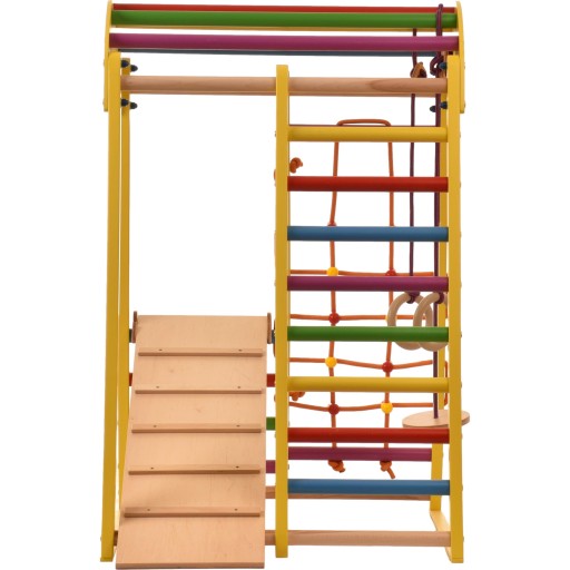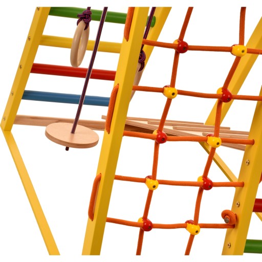 - 5 w 1: trójkąt wspinaczkowy składa się z połączonych ze sobą: drabinki szwedzkiej, siatki do wspinaczki, huśtawki, uchwytów do podciągania się oraz zjeżdżalni, którą można zamienić w trap.