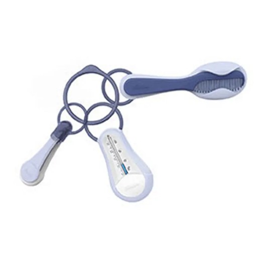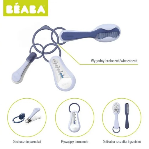 Beaba Akcesoria do pielęgnacji: termometr do kąpieli, obcinaczka, szczoteczka i grzebień mineral , francuskiej marki BEABA. Utrzymany w łagodnych odcieniach niebieskiego. Zawiera 4 elementy, które można przypiąć razem na wygodnym kółku, co ułatwia utrzymanie porządku i oszczędza miejsce.