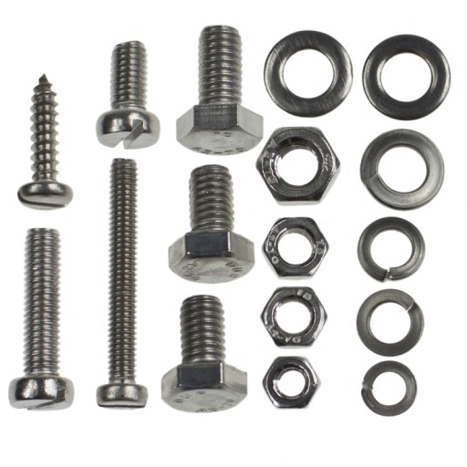 - zestaw zawiera śruby pełno gwintowane oraz nie pełno, podkładki, podkładki sprężynujące, nakrętki, śruby stożkowe