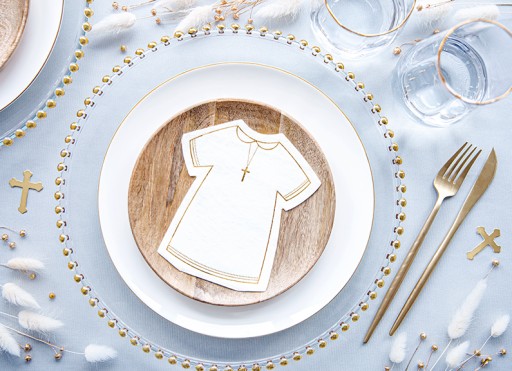 Serwetki dekoracyjne stanowią obowiązkowy element dekoracji stołu komunijnego. Można je złożyć w fantazyjne kształty, dzięki czemu są nie tylko praktyczne, ale również ozdobne. Umożliwiają ciekawą zabawę formą przestrzenną, która z pewnością zostanie doceniona przez gości.