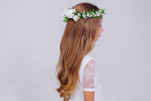 Jedna z najciekawszych propozycji 2022. Wianek wykonany z najwyższej jakości materiałów. Przeważający kolor zielony oraz biały dodają lekkości oraz podkreślają delikatną urodę dziewczynek, wygląda bardzo świeżo.