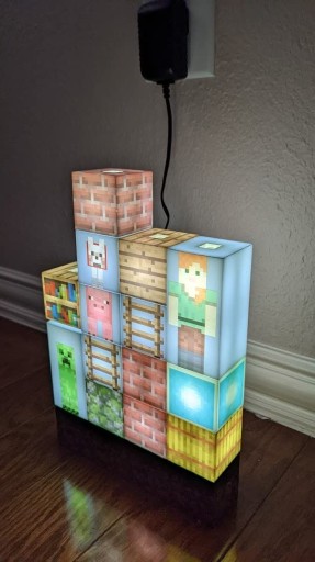 Lampka Minecraft Bloki Postaci to idealny gadżet dla fanów gry Minecraft, który przenosi kultowy pikselowy styl prosto do Twojego wnętrza. Składa się z 14 podświetlanych bloków o wymiarach 4x4x4 cm i 4x8x4 cm, które możesz dowolnie układać, tworząc unikalne kompozycje i wzory pasujące do Twojego gustu. To świetny wybór na biurko, szafkę nocną lub półkę w pokoju dziecięcym, który nada przestrzeni wyjątkowego klimatu.