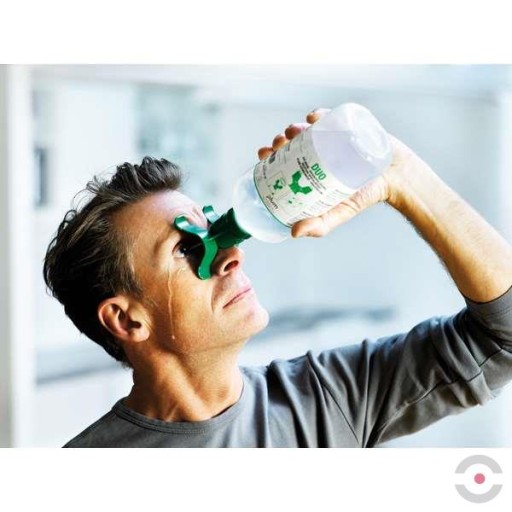 - Nakrętka jest jednocześnie podwójną (DUO) wylewką płuczki, której kształt pomaga zachować otwarte oczy podczas płukania a także przemywać je jednocześnie w sposób łagodny i równomierny