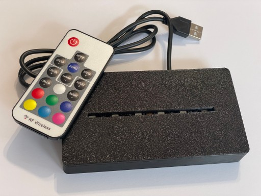 Podstawka, baza led na lampki wykonywane z pleksi o grubości do 3mm. Podstawka wraz z zamontowaną taśmą RGB (różne kolory świecenia) w zestawie jest pilot RF ! (dużo lepszy od pilotów na podczerwień) oraz na stałe załączony do podstawki kabel z wtyczką USB o długości ok 95cm (daje to bardzo duże możliwości podłączenia zasilania) Wymiary podstawki to ok 130x70x20mm z gniazdem na pleksi o wymiarach 90-92x3mm.