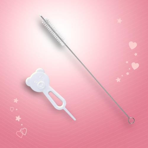 Do butelek Neno Bottle dołączone są przydatne dodatki: szczoteczka do czyszczenia rurki oraz igła do przetykania w kształcie misia. Służą one do dokładnego wyczyszczenia i ewentualnego odetkania pływaka z resztek przecieranych gęstych soczków.