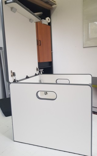 Szafka z przenośną toaletą jest idealnym rozwiązaniem przy parkowaniu w mieście. Szafka może także służyć jako stolik.