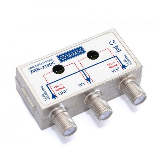 ZWR-210DC to zwrotnica antenowa posiadająca dwa wejścia: VHF i UHF oraz jedno wyjście. Urządzenie służy do sumowania sygnałów z anten telewizyjnych VHF oraz UHF.Zwrotnica zapewnia przeniesienie napięcia zasilającego z wejścia do wyjść VHF i UHF, umożliwiając zasilanie przedwzmacniaczy antenowych. W tym celu we właściwej listwie kołkowej, dostępnej przez jeden z otworów w obudowie, należy przestawić zworę do pozycji poziomej. W przypadku współpracy zwrotnicy z antenami biernymi, zwory powinny pozostać w pozycji pionowej.