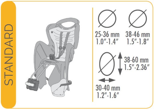 - możliwy montaż do rur podsiodłowych o przekroju okrągłym i średnicach 25-36mm, 38-46mm oraz owalnych o średnicy 38-60mm na 30-40mm