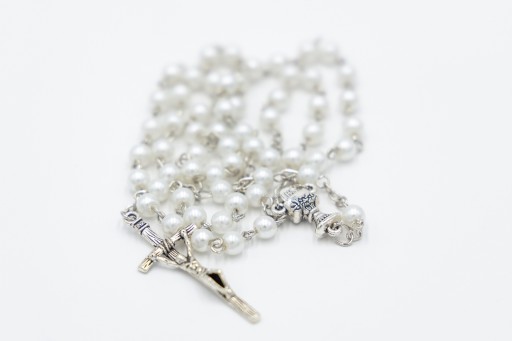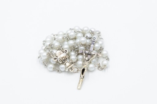 Biały różaniec komunijny z kielichem