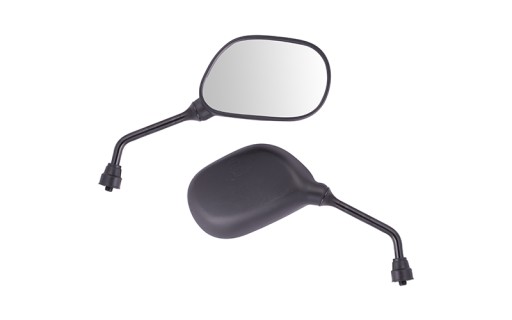 Czarne matowe lusterka o klasycznym kształcie. Mocowane są na solidnym metalowym uchwycie o średnicy gwintu 8 mm. Posiadają estetyczną gumową osłonę na mocowanie. Wyposażone są w otwory umożliwiające odprowadzanie wody.