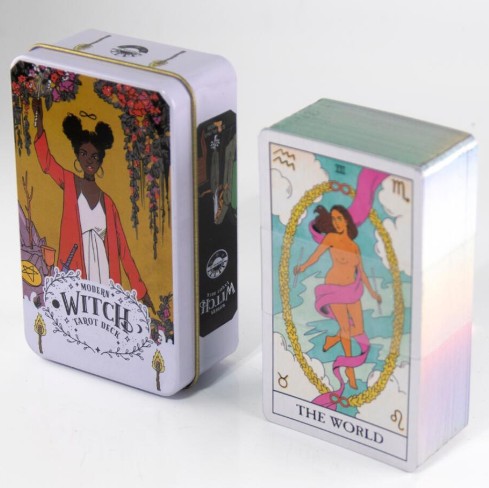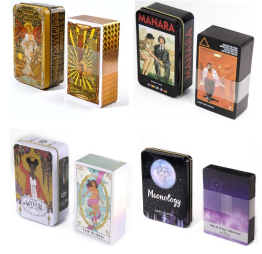 Opakowanie: Każda karta tarota lub wyrocznia ma blaszane pudełko z nadrukowaną odpowiednią okładką