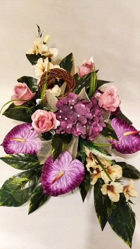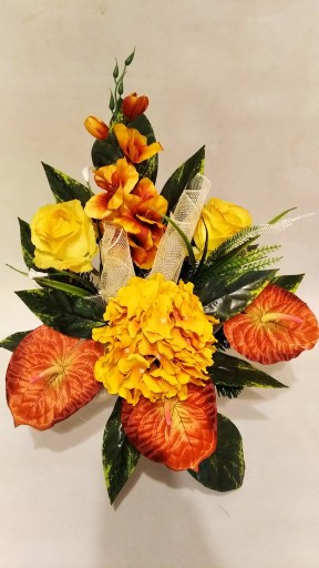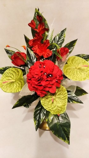 Kompozycja sztuczna (tzw. stroik, ikebana) jest wykonana z sztucznej choiny w SKRZYNCE DREWNIANIEJ co daje jej stabilność.