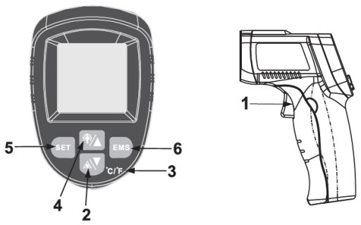 - Spust do uruchamiania pirometra i rozpoczęcia pomiaru.
