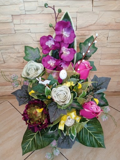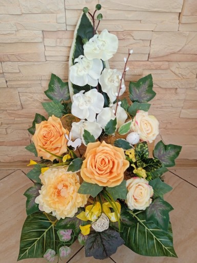 Kompozycja sztuczna (tzw. stroik, ikebana) jest wykonana z sztucznej choiny w doniczce plastikowej co daje jej stabilność.