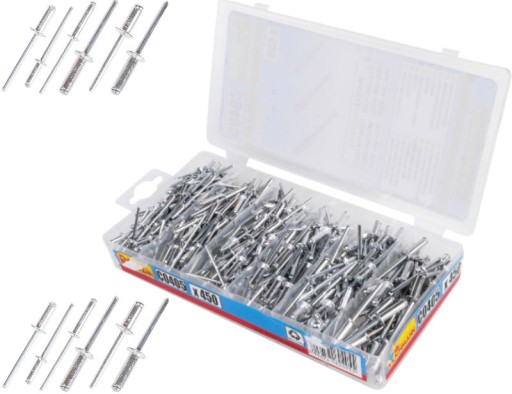 - Zestaw 450 sztuk nitów aluminiowych zrywalnych w różnych rozmiarach.