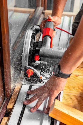 Dodatkowo na całej długości listwy posiadają gumową wkładkę przeciwodpryskową, która przy pierwszym użyciu samoczynnie dopasuje się do używanego narzędzia. Istnieje możliwość przymocowania szyn do obrabianej powierzchni za pomocą dedykowanych zacisków, co pozwala użytkownikowi skupić się wyłącznie na prowadzeniu pilarko-zagłębiarki w celu osiągnięcia zamierzonego efektu cięcia.