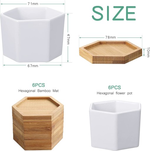 - Dodatkowe akcesoria do utrzymania czystości i pożegnania się z bałaganem: Nasz zestaw ceramicznych sześciokątnych doniczek zawiera bambusowe tace i siatkowe podkładki.