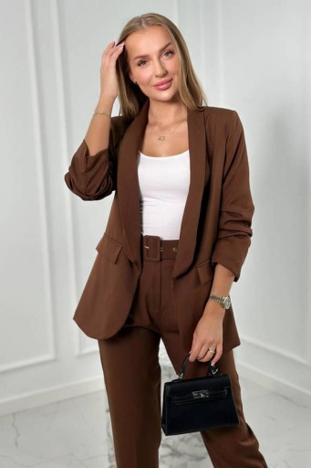 Prezentujemy Państwu elegancki komplet marynarki i spodni. Marynarka bez zapięcia z klapami z przodu. Marynarka posiada podszewkę. Spodnie z kieszeniami oraz paskiem. W pasie spodni z tyłu wszyta elastyczna taśma. Bardzo modny i stylowy komplet. Komplet wykonany jest z wysokiej jakości materiału. Rozmiar jest uniwersalny i będzie odpowiedni dla Pań w rozmiarze S, M lub L.