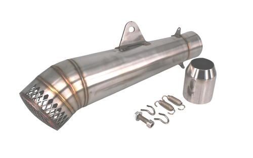 Sportowy tłumik wykonany ze stali nierdzewnej w polerce na kolor tytanowy. Grube ścianki i waga tłumika świadczą o jego jakości. Spawy TIG-iem są równe i idealnie zlane. Środek wydechu jest wyłożony matą tłumiącą, a sam wydech jest na "przestrzał". Po założeniu tłumika otrzymujemy donośny basowy dźwięk które wyraźnie wzmacnia brzmienie silnika. Końcówka zabezpieczona jest siatką ze stali nierdzewnej - bardzo intrygujący wygląd.