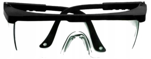 Przeciwodpryskowe okulary ochronne. Klasa optyczna 1 o bezbarwnych soczewkach, ramka w kolorze czarnym,posiadają regulację w długości ramion.
