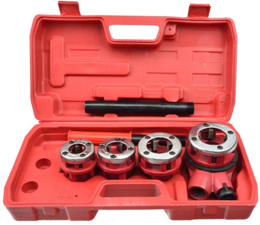 Gwintownica hydrauliczna do rur w zestawie z 4 narzynkami. Urządzenie służy do gwintowania rur i kształtek.