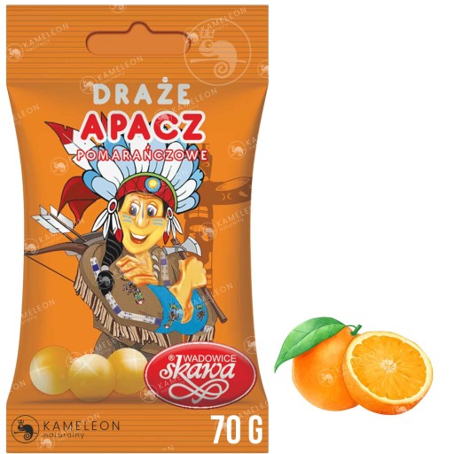 Draże APACZ: cukier, serwatka w proszku, glukoza, częściowo utwardzony tłuszcz palmowy, wafle (mąka pszenna, skrobia, olej rzepakowy, sól), syrop glukozowy, skórka pomarańczowa kandyzowana 0,5%, aromaty, kwas: kwas cytrynowy, barwnik E 120, olej palmowy, substancja glazurująca: E 901, emulgator: lecytyny (z soi).
