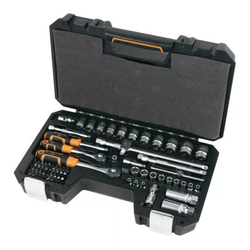 - prace warsztatowe, majsterkowanie: 12x nasadka 6-kątna; 11x nasadka 12-kątna; 2x przedłużka; uchwyt przesuwny; przegub uniwersalny; grzechotka; adaptery do bitów; 30x bit; 2x nasadka do świec zapłonowych